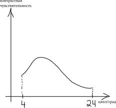 По ОХ идёт частота синусоиды, измеряемая в циклах на угловой градус. Мы хотим найти оператор эмпирически, передаточную функцию, которая по ОУ выражалась бы в контрастной чувствительности. Будем менять частоту черно-белой решетки и смотреть как воспринимается её контраст. Оказывается, что контрастная чувствительность в этих пределах довольно резко изменяется. Т.е. она зависит от частоты решетки и бывают такие частоты, где мы уже не замечаем контраста (при условии одинаковой амплитуде).
