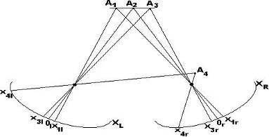 На окружности построенной на точках А, В и С точки будут корреспондироваться. На этой окружности будет теоретический гороптер [523] – это геометрическое место точек, которые попадают на корреспондирующие точки сетчаток при данном угле конвергенции. Следующий термин диспаратность[524]. Диспаратность есть количественная мера параллакса.