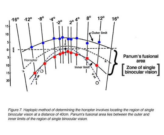 На другом рисунке видна область сетчатки, которая вообще-то говоря способна воспринимать пространство. Ведь это же полуокружность. Есть область, которая воспринимается только одним глазом и то же с другим. И получаем что есть участки пространства монокулярного восприятия. И есть область бинокулярного восприятия. Гороптер теоретический и он таковым не является. Диспаратность, диплопия это всё есть лишь подготовка к т.н. зонам стереопсиса[526].