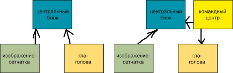 Идея Гельмгольца состояла в следующем. Вот есть две те же самые системы И-С и Г-Г, есть тот же самый центральный блок (блок сличения по Бернштейну). Но есть ещё один блок, управляющий движениями глаз (К – командный центр). Что касается системы И-С всё остаётся прежним. А вот дальше из К даётся команда системе Г-Г и на Ц после чего глаза двигаются. Каждый может проверить. Сидя около письменного стола и глядя на лампу. Остаётся отпечаток от лампы и он стабилизирован на сетчатке. Т.е. систему И-С мы стабилизировали. И тогда справедливость теорий Шеррингтона и Гельмгольца проверить можно. Сначала подвигать глаза руками, а затем без помощи рук. В каком-то случае изображение будет меняться, в каком-то нет.
