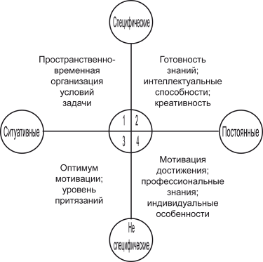 Построим простейшую схему факторов, влияющих на успешность решения задач. Два основания. Первое – специфические, неспецифические факторы. Второе – ситуативные факторы имеют место только при решении задачи, постоянные например индивидуальные свойства субъекта, существующие и помимо самого процесса, но участвующие в нём.