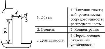 а) Сама модель волны внимания предполагает, что сознание в целом и его центр внимания имеют определенную направленность (1). Здесь пригодятся не только модели структурализма, но и функциональная модель Джемса, где внимание как поток, имеющий направление, которое задаёт сам поток как внутренне свойство. Рядом избирательность (2) внимания. Это не просто свойство внимания, а характеристика, которая входит в само определение внимания. Сосредоточенность (3) на материале. Эта характеристика фактически тождественна понятию объёма, но предполагает ещё и то, что в поле внимания может быть как один фокус, так и несколько. У нашей области есть некоторый единый центр и фокусных точек становится не одна а две, то наш испытуемый теряет возможность быть внимательным. Можно получить патологический случай расщепления внимания, утрата фокуса, центра. Но если испытуемый может сохранять единство объема своего внимания, несмотря на то, что фокусов может быть несколько (по-крайней мере два), то имеем дело с ещё одним свойством распределения (4) внимания. Это есть способность совмещать в сознании, одновременно представлять по-крайней мере два выполняемых субъектом действия.