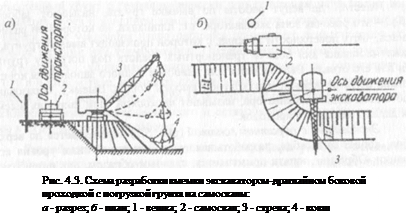Экскаватор с прямой лопатой (рис. 4.1) применяют для разработки широких выемок в грунтах нормальной влажности. Экскаватор перемещается по дну выемки, копает «от себя» снизу вверх с погрузкой разрабатываемого грунта на транспортные средства- автосамосвалы, железнодорожные вагоны, подаваемые в радиус действия стрелы экскаватора.