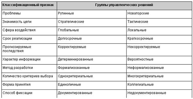 Классификация управленческих решений