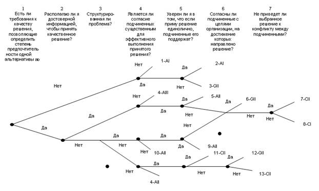 От чего же зависит выбор руководителем какого-либо из этих возможных стилей? Во-первых, от характера ситуации и, во-вторых, от характера проблемы. Чтобы помочь руководителю оценить ситуацию, Врум и Йеттон разработали 7 критериев, по которым оценивается ситуация «подчиненные — руководитель», и модель дерева решений.