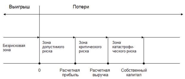 Зона допустимого риска — область, в пределах которой величина вероятных потерь не превышает ожидаемой прибыли и, следовательно, коммерческая деятельность имеет экономическую целесообразность. Граница зоны допустимого риска соответствует уровню потерь, равному расчетной прибыли.