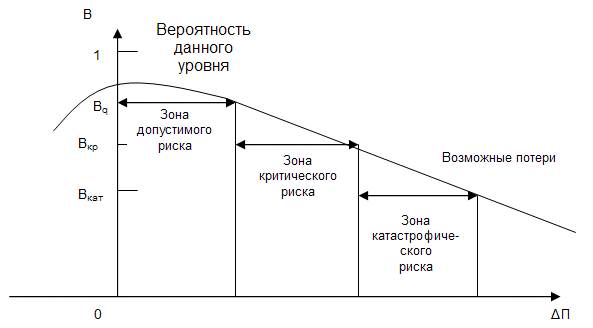 И, наконец, зона катастрофического риска — область вероятных потерь, которые превосходят критический уровень и могут достигать величины, равной собственному капиталу организации. Катастрофический риск способен привести организацию или предпринимателя к краху и банкротству. Кроме того, к категории катастрофического риска, независимо от величины имущественного ущерба, следует отнести риск, связанный с угрозой жизни или здоровью людей и возникновением экологических катастроф.