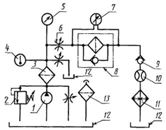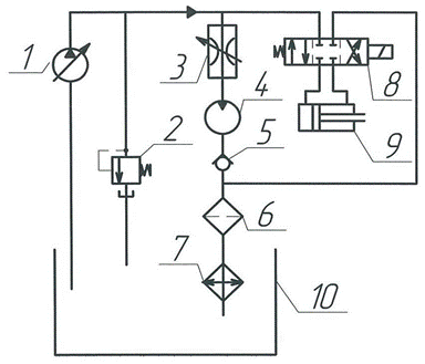 | 1- насос; 2 - предохранительный клапан непрямого действия; 3 - гидрароспределитель; 4,7 - вторичные предохранительные клапаны непрямого действия; 5 - гидромотор; 6 - гидроцилиндр; 8 - обратный клапан; 9 - фильтр; 10 - гидробак. Задание 2 1 - насос; 2 - предохранительный гидроклапан; 3 - технологический фильтр; 4 - термометр; 5 - манометр; 6 - дроссель; 7 - манометр дифференциальный; 8 - фильтр испытуемый; 9 - обратный клапан; 10 - расходомер; 11 - теплообменный аппарат; 12 - гидробак; 13 - сапун. Задание 3