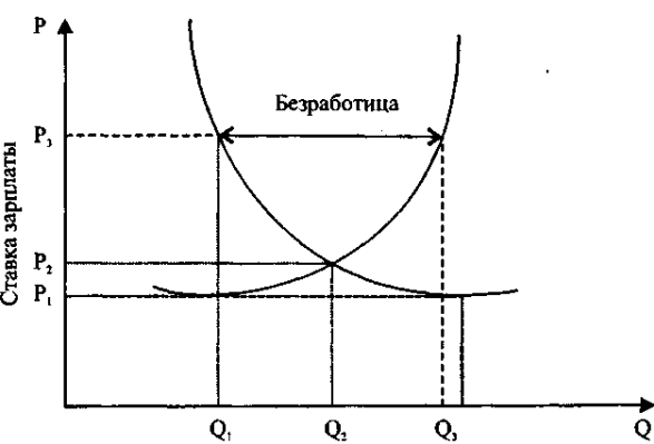 На конкурентном рынке при уровне заработной платы Р2 достигается равновесие: спрос на труд (Q2) полностью удовлетворяют, и все, кто готовы работать при заработной плате Р2, могут иметь работу.