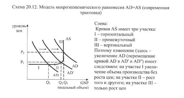 При конкретизации формы кривой совокупного предложения новое звучание получает проблема общего рыночного равновесия. Условия, при которых это равновесие наступает, будут различны, поскольку последствия увеличения совокупного спроса зависят от того, на каком отрезке кривой совокупного предложения произойдет пересечение с новой кривой совокупного спроса.