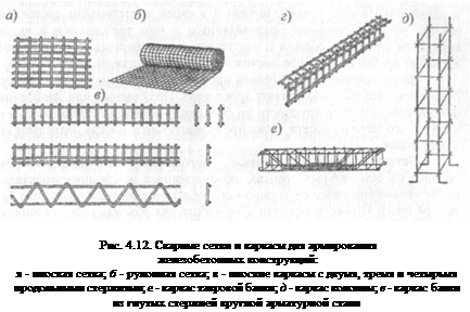 Резку и гнутье стержней производят на специальных станках. На рис. 4.12 показаны сварные сетки и каркасы заводского изготовления. Сварку производят на одноэлектродных машинах, а при больших объемах арматурных работ на заводах железобетонных конструкций применяют автоматические многоэлектродные машины, которые изготавливают пространственные каркасы колонн и балок и плоские сварные сетки с заданными размерами по длине, ширине и величине ячейки сеток.