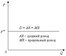 В условиях совершенной конкуренции фирма выступает в качестве ценополучателя (price-taker). Кривая спроса на ее продукцию имеет вид прямой, параллельной оси выпуска. Общая выручка фирмы изменяется пропорционально изменению выпуска продукции, средняя и предельная выручки равны и совпадают с ценой (p*=MR=AR).