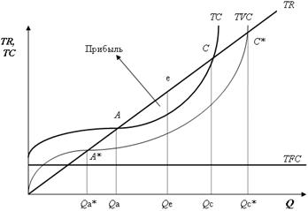 Точки А и С – точки критического объема производства: любые объемы за пределами этих точек (<Qa или >Qc) принесут убытки, т. к. общая выручка меньше общих затрат (TR<TC).