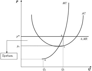При объеме производства Qa предельные издержки минимальны. Однако фирма, стремящаяся к максимизации прибыли, должна продолжить расширять производство до Qe, где MR=MC. Прибыль на единицу продукции равна разнице между ценой и средними издержками (p–AC) или ес – на графике. Общая величина прибыли будет равна площади pcp*ec.