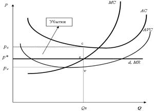 В данной ситуации убытки фирмы равны площади p*pcce. Стремясь минимизировать убытки, фирма должна попытаться покрыть выручкой средние постоянные затраты: AFC=AC–AVC. Если цена выше AVC, то фирме это удастся.