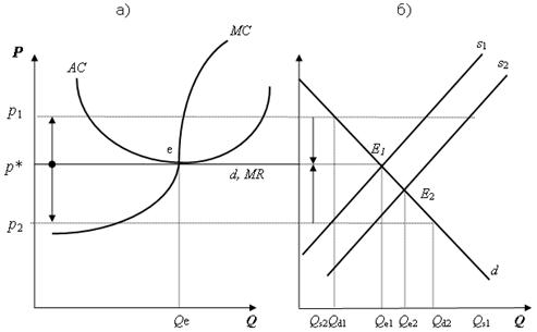 Рис. 6. Оптимум конкурентной фирмы в долгосрочном периоде: a) предприятие, б) отрасль