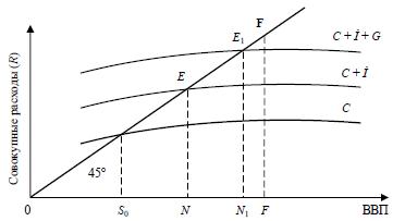 При равенстве доходов и расходов уровень ВВП установится в точке S0, т.е. на уровне нулевого сбережения. Однако, если к расходам на личное потребление добавить инвестиции, то линия С сдвинется вверх и займёт положение C + І. Теперь кривая C + І пересечёт линию 45° (линию равенства доходов и расходов) в точке E. Этой точке будет соответствовать объём ВВП в размере ON. Точка N приблизилась к точке F, т.е. тому уровню ВВП, который соответствует полной занятости. Чем больше инвестиции, тем выше поднимается кривая C + І и тем ближе уровень полной занятости.