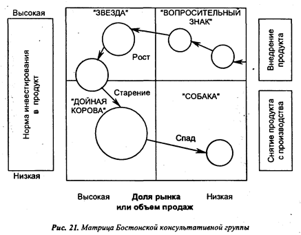 При анализе портфеля продукции, т.е. вариантов инвестиций, сравнивают долю фирмы или ее изделий на рынке с темпами роста всей хозяйственной деятельности. Здесь может быть использована матрица Бостонской консультативной группы (рис. 21), которая поможет при выборе той или иной стратегии. Например, если изделие фирмы занимает большую долю рынка и имеет высокие темпы роста ("звезда"), фирма скорее всего будет придерживаться стратегии роста, и наоборот, если изделие занимает малую долю рынка и имеет низкие темпы роста ("собака"), фирма может выбрать стратегию сокращения.