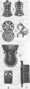 | Предметы женского туалета у булгар: 1 — 2 — плоские флакончатые подвески для духов, 3 — бронзовые зеркала, 4 — подвески- лунницы, 5 — сумочка для предметов огнива, 6 — подвески в форме гребня, 7 — костяной гребень |