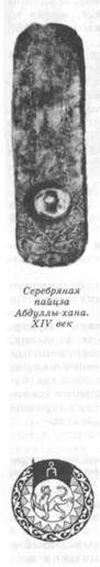 Помимо ярлыков действовала система выдачи так называемых пайцзы. Пайцза — это золотая, серебряная, бронзовая или чугунная, а то и просто деревянная дощечка, выдаваемая от имени хана в качестве своеобразного мандата. Человеку, предъявившему такой мандат, гарантировалась безопасность и предоставлялись необходимые услуги при его передвижениях и поездках — провожатые, лошади, помещения, пропитание. Само собой разумеется, золотую пайцзу получал человек знатного рода, выполняющий особо важные государственные задания.