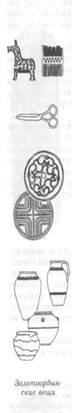 Найденные золотые и серебряные, богато орнаментированные сосуды (кубки, чаши, кувшины), медальоны, ожерелья, браслеты, перстни, круглые металлические зеркала и другие изящные вещи, в изготовлении которых применяли гравировку, скань, зернь, филигрань и другие приемы, свидетельствуют о высоком развитии ювелирного искусства.