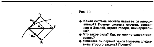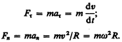 В механике большое значение имеет принцип независимости действия сил: если на материальную точку действует одновременно несколько сил, то каждая из этих сил сообщает материальной точке ускорение согласно второму закону Ньютона, как будто других сил не было. Согласно этому принципу, силы и ускорения можно разлагать на составляющие, использование которых приводит к существенному упрощению решения задач. Например, на рис. 10 действующая сила F= m a разложена на два компонента: тангенциальную силу Ft, (направлена по касательной к траектории) и нормальную силу F n (направлена по нормали к центру кривизны). Используя выражения