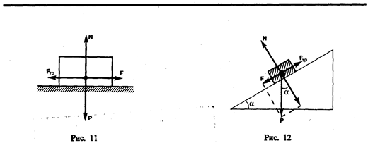 Рассмотрим лежащее на плоскости тело (рис. 11), к которому приложена горизонтальная сила F. Тело придет в движение лишь тогда, когда приложенная сила F будет больше силы трения Fтр. Французские физики Г. Амонтон (1663—1705) и Ш. Кулон (1736—1806) опытным путем установили следующий закон: сила трения скольжения F тр пропорциональна силе N нормального давления, с которой одно тело действует на другое: