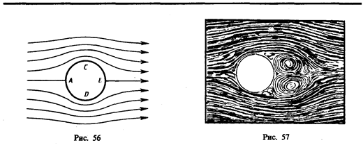 Иначе обстоит дело при движении тел в вязкой жидкости (особенно при увеличении скорости обтекания). Вследствие вязкости среды в области, прилегающей к поверхности тела, образуется пограничный слой частиц, движущихся с меньшими скоростями. В результате тормозящего действия этого слоя возникает вращение частиц и движение жидкости в пограничном слое становится вихревым. Если тело не имеет обтекаемой формы (нет плавно утончающейся хвостовой части), то пограничный слой жидкости отрывается от поверхности тела. За телом возникает течение жидкости (газа), направленное противоположно набегающему потоку. Оторвавшийся пограничный слой, следуя за этим течением, образует вихри, вращающиеся в противоположные стороны (рис. 57).