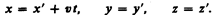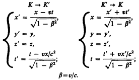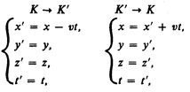 заменяются преобразованиями Лоренца, удовлетворяющими постулатам Эйнштейна (формулы представлены для случая, когда К' движется относительно К со скоростью v вдоль оси х).