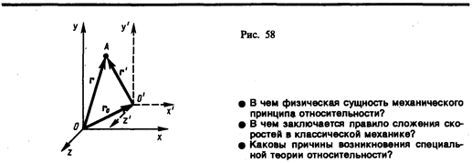 Для его доказательства рассмотрим две системы отсчета: инерциальную систему K (с координатами х, у, z), которую условно будем считать неподвижной, и систему K' (с координатами x', у', z'), движущуюся относительно K равномерно и прямолинейно со скоростью u (u=const). Отсчет времени начнем с момента, когда начала координат обеих систем совпадают. Пусть в произвольный момент времени t расположение этих систем друг относительно друга имеет вид, изображенный на рис. 58. Скорость u направлена вдоль OO', радиус-вектор, проведенный из О в О', r 0 = u t.