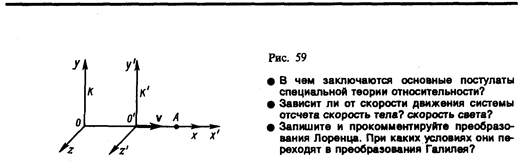Для иллюстрации этого вывода рассмотрим две инерциальные системы отсчета: К (с координатами х, у, z) и К' (с координатами х', у', z'), движущуюся относительно К (вдоль оси х) со скоростью v = const (рис. 59). Пусть в начальный момент времени t=t'= 0, когда начала координат О и О' совпадают, излучается световой импульс. Согласно второму постулату Эйнштейна, скорость света в обеих системах одна и та же и равна с. Поэтому если за время t в системе К сигнал дойдет до некоторой точки А (рис. 59), пройдя расстояние