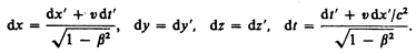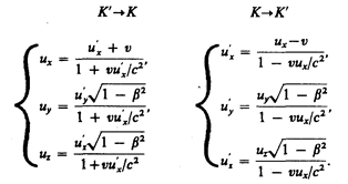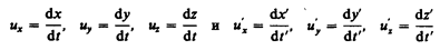 представляют собой соответственно проекции на оси х, у, z и х', у', z' вектора скорости рассматриваемой точки относительно систем К и К'. Согласно преобразованиям Лоренца (36.3),