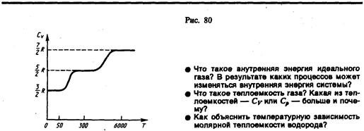 По закону равномерного распределения энергии по степеням свободы (см. § 50), для комнатных температур СV = 7 / 2 R. Из качественной экспериментальной зависимости молярной теплоемкости СV водорода (рис. 80) следует, что СV зависит от температуры: при низкой температуре (»50 К) СV = 3 / 2 R, при комнатной — CV = 5 / 2 R (вместо расчетных 7/2 R) и при очень высокой — Сv= 7/2 R. Это можно объяснить, предположив, что при низких температурах наблюдается только поступательное движение молекул, при комнатных — добавляется их вращение, а при высоких — к этим двум видам движения добавляются еще колебания молекул.