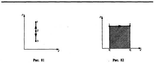 Изохорный процесс (V =const). Диаграмма этого процесса (изохора) в координатах р, V изображается прямой, параллельной оси ординат (рис. 81), где процесс 1—2 есть изохорное нагревание, а 1 — 3 — изохорное охлаждение. При изохорном процессе газ не совершает работы над внешними телами, т. е.