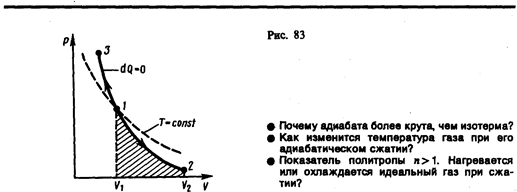 Диаграмма адиабатического процесса (адиабата) в координатах р, V изображается гиперболой (рис. 83). На рисунке видно, что адиабата (pVg = const) более крута, чем изотерма (pV = const). Это объясняется тем, что при адиабатическом сжатии 1 — 3 увеличение давления газа обусловлено не только уменьшением его объема, как при изотермическом сжатии, но и повышением температуры.