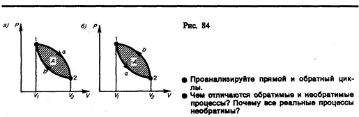 > 0 (цикл протекает по часовой стрелке), то он называется прямым (рис. 84, а), если за цикл совершается отрицательная работа A=