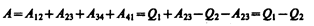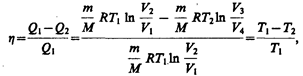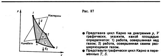 Цикл Карно изображен на рис. 87, где изотермические расширение и сжатие заданы соответственно кривыми 1 — 2 и 3—4, а адиабатические расширение и сжатие — кривыми 2 — 3 и 4—1. При изотермическом процессе U= const, поэтому, согласно (54.4), количество теплоты Q 1, полученное газом от нагревателя, равно работе расширения А 12, совершаемой газом при переходе из состояния 1 в состояние 2: