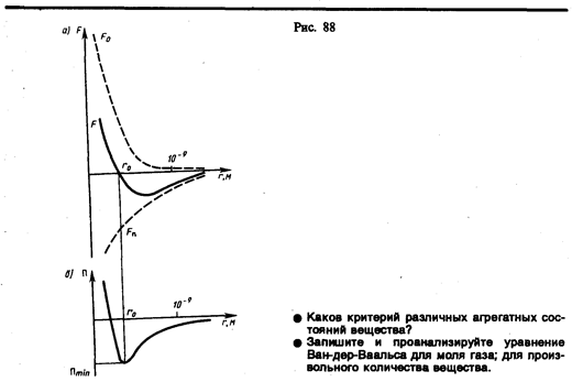 В XX в., по мере развития представлений о строении атома и квантовой механики, было выяснено, что между молекулами вещества одновременно действуют силы притяжения и силы отталкивания. На рис. 88, а приведена качественная зависимость сил межмолекулярного взаимодействия от расстояния r между молекулами, где F о и F п — соответственно силы отталкивания и притяжения, a F — их результирующая. Силы отталкивания считаются положительными, а силы взаимного притяжения — отрицательными.