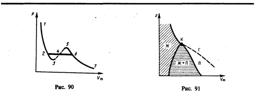Если через крайние точки горизонтальных участков семейства изотерм провести линию, то получится колоколообразная кривая (рис. 91), ограничивающая область двухфазных состояний вещества. Эта кривая и критическая изотерма делят диаграмму р,V m под изотермой на три области: под колоколообразной кривой располагается область двухфазных состояний (жидкость и насыщенный пар), слева от нее находится область жидкого состояния, а справа — область пара. Пар отличается от остальных газообразных состояний тем, что при изотермическом сжатии претерпевает процесс сжижения. Газ же при температуре выше критической не может быть превращен в жидкость ни при каком давлении.