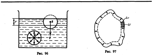 Из практики известно, что капля воды растекается на стекле и принимает форму, изображенную на рис. 98, в то время как ртуть на той же поверхности превращается в несколько сплюснутую каплю (рис. 99). В первом случае говорят, что жидкость смачивает твердую поверхность, во втором — не смачивает ее. Смачивание зависит от характера сил, действующих между молекулами поверхностных слоев соприкасающихся сред. Для смачивающей жидкости силы притяжения между молекулами жидкости и твердого тела больше, чем между молекулами самой жидкости, и жидкость стремится увеличить поверхность соприкосновения с твердым телом. Для несмачивающей жидкости силы притяжения между молекулами жидкости и твердого тела меньше, чем между молекулами жидкости, и жидкость стремится уменьшить поверхность своего соприкосновения с твердым телом.