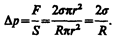 Разделив эту силу на площадь основания сегмента p r 2, вычислим избыточное давление на жидкость, создаваемое силами поверхностного натяжения и обусловленное кривизной поверхности: