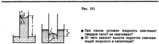 Если поместить узкую трубку (капилляр) одним концом в жидкость, налитую в широкий сосуд, то вследствие смачивания или несмачивания жидкостью стенок капилляра кривизна поверхности жидкости в капилляре становится значительной. Если жидкость смачивает материал трубки, то внутри ее поверхность жидкости — мениск — имеет вогнутую форму, если не смачивает — выпуклую (рис. 101).