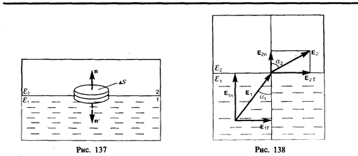 На границе раздела двух диэлектриков (рис. 137) построим прямой цилиндр ничтожно малой высоты, одно основание которого находится в первом диэлектрике, другое — во втором. Основания D S настолько малы, что в пределах каждого из них вектор D одинаков. Согласно теореме Гаусса (89.3),