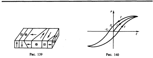 При отсутствии внешнего электрического поля сегнетоэлектрик представляет собой как бы мозаикуиз доменов — областей с различными направлениями поляризованности. Это схематически показано на примере титаната бария (рис. 139), где стрелки и знаки