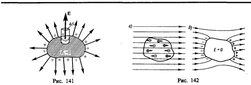 Если во внешнее электростатическое поле внести нейтральный проводник, то свободные заряды (электроны, ионы) будут перемещаться: положительные — по полю, отрицательные — против поля (рис. 142, а). На одном конце проводника будет скапливаться избыток положительного заряда, на другом — избыток отрицательного. Эти заряды называются индуцированными. Процесс будет происходить до тех пор, пока напряженность поля внутри проводника не станет равной нулю, а линии напряженности вне проводника — перпендикулярными его поверхности (рис. 142, б). Таким образом, нейтральный проводник, внесенный в электростатическое поле, разрывает часть линий напряженности; они заканчиваются на отрицательных индуцированных зарядах и вновь начинаются на положительных. Индуцированные заряды распределяются на внешней поверхности проводника. Явление перераспределения поверхностных зарядов на проводнике во внешнем электростатическом поле называется электростатической индукцией.