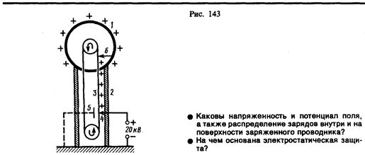 Свойство зарядов располагаться на внешней поверхности проводника используется для устройства электростатических генераторов, предназначенных для накопления больших зарядов и достижения разности потенциалов в несколько миллионов вольт. Электростатический генератор, изобретенный американским физиком Р. Ван-де-Граафом (1901—1967), состоит из шарообразного полого проводника 1 (рис. 143), укрепленного на изоляторах 2. Движущаяся замкнутая лента 3 из прорезиненной ткани заряжается от источника напряжения с помощью системы остриев 4, соединенных с одним из полюсов источника, второй полюс которого заземлен. Заземленная пластина 5 усиливает стекание зарядов с остриев на ленту. Другая система остриев 6 снимает заряды с ленты и передает их полому шару, и они переходят на его внешнюю поверхность. Таким образом, сфере передается постепенно большой заряд и удается достичь разности потенциалов в несколько миллионов вольт. Электростатические генераторы применяются в высоковольтных ускорителях заряженных частиц, а также в слаботочной высоковольтной технике.
