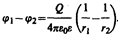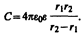 Для определения емкости сферического конденсатора, состоящего из двух концентрических обкладок, разделенных сферическим слоем диэлектрика, используем формулу (86.2) для разности потенциалов между двумя точками, лежащими на расстояниях r 1 и r 2 (r 2 > r 1) от центра заряженной сферической поверхности. При наличии диэлектрика между обкладками разность потенциалов