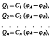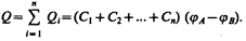 1. Параллельное соединение конденсаторов (рис. 144). У параллельно соединенных конденсаторов разность потенциалов на обкладках конденсаторов одинакова и равна jA – jB. Если емкости отдельных конденсаторов С 1, С 2 ,..., Сn, то, согласно (94.1), их заряды равны
