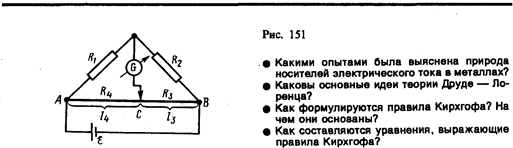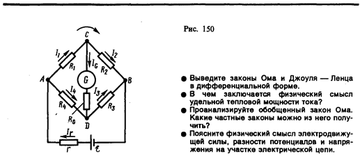 В качестве примера использования правил Кирхгофа рассмотрим схему (рис. 150) измерительного моста Уитстона. * Сопротивления R 1, R 2, R 3и R 4 образуют его «плечи». Между точками А и В моста включена батарея с э.д.с.