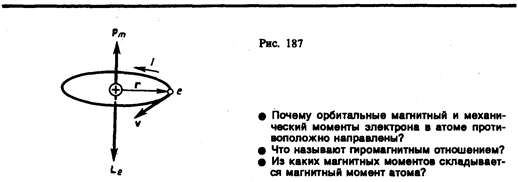 где I=en — сила тока, n — частота вращения электрона по орбите, S — площадь орбиты. Если электрон движется по часовой стрелке (рис. 187), то ток направлен против часовой стрелки и вектор р m (в соответствии с правилом правого винта) направлен перпендикулярно плоскости орбиты электрона, как указано на рисунке.